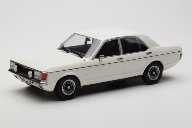 The Ford Granada Mk1 Blanco MCG 1:18 is crafted from Metal. Die-cast zinc alloy body with detailed plastic parts, rubber tires, and high-quality paint finish. Die-cast models are known for their weight, durability, and realistic feel.