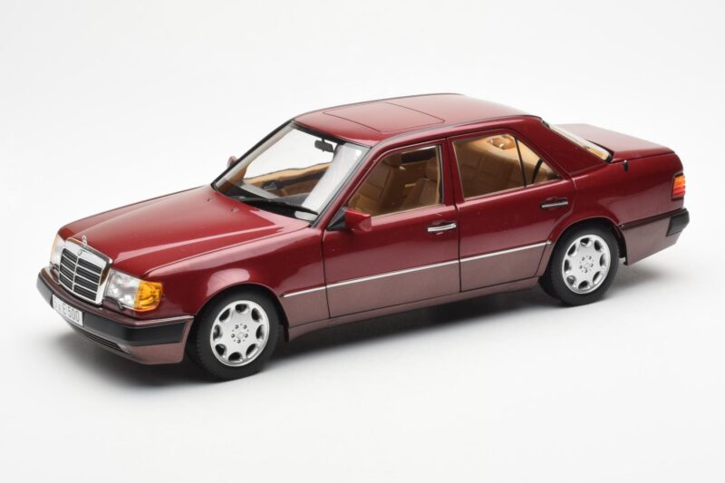 The Mercedes 500E W124 Rojo Metallic Edición Concesionario Norev 1:18 is crafted from Metal. Die-cast zinc alloy body with detailed plastic parts, rubber tires, and high-quality paint finish. Die-cast models are known for their weight, durability, and realistic feel.