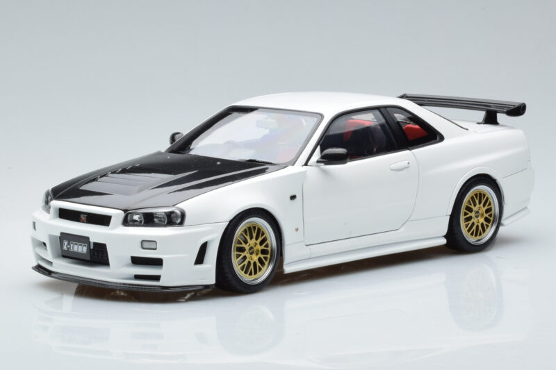 The Nissan Skyline GT-R R34 Nismo Z-Tune Blanco MotorHelix 1:18 is crafted from Metal. Die-cast zinc alloy body with detailed plastic parts, rubber tires, and high-quality paint finish. Die-cast models are known for their weight, durability, and realistic feel.