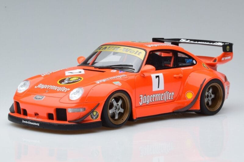 The Porsche 911 993 RWB Jagermeister Asia Edition GT Spirit 1:18 is crafted from Resina. High-quality resin with hand-painted details and limited production runs. Resin models offer exceptional detail and are prized by serious collectors for their craftsmanship.