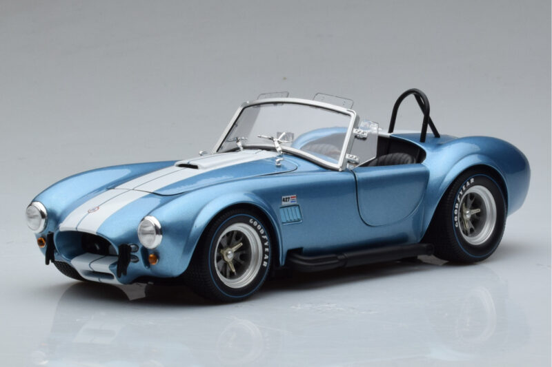 The Shelby Cobra 427 S/C Azul Claro Kyosho 1:18 is crafted from Metal. Die-cast zinc alloy body with detailed plastic parts, rubber tires, and high-quality paint finish. Die-cast models are known for their weight, durability, and realistic feel.