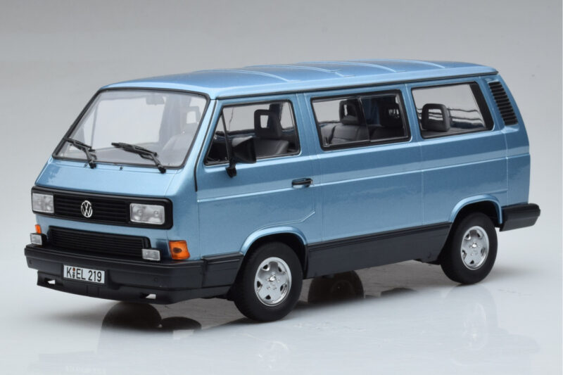 A 1:18 scale model measures approximately 25-28 cm (approximately 10-11 inches). The Volkswagen T3 Multivan Azul Norev 1:18 is perfect for display in a glass cabinet or on a shelf.